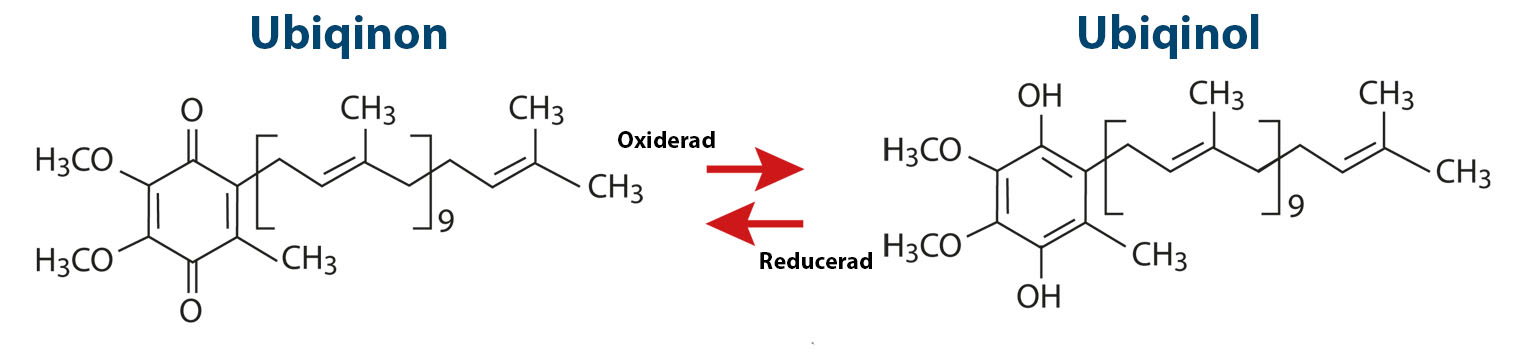 När oxiderat Q10 (ubiqinon) mottar elektroner från en annan molekyl i reaktionskedjan blir molekylen reducerad (ubiqinol) och när reducerat Q10 (ubiqinol) donerar elektroner, blir det återigen oxiderat (ubiqinon). I mitokondriernas inre membran tar Q10 upp de elektroner som överförs mellan komplex I och III eller komplex II och III i elektrontransportkedjan. Att upprätthålla denna jämvikt mellan reducerad och oxiderad form är hur kroppen drar nytta av Q10.